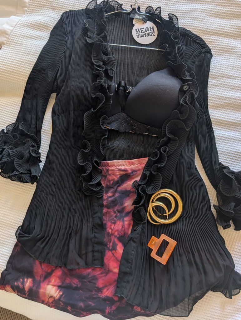 This was also a thrift find but more specifically a ‘yeah vintage’ find, lovely boutique shop in Margaret River with many pieces that flattered my flat chest and wide rectangle 5′ 2″ body type. Shear tops have become very common for going out shirts, maybe dated by this point but what made this top work was the texture and cut. Though it is made up of some slightly stretchy poly something or other the intentional creasing elongated my body. The creases fade which naturally allows the blouse to flare because the excess fabric thus lays nicely over the curves of the wearer. Ruffles on the chest further created the hour-glass shape and some fun texture up around my neck. My hair was not clean and was going back in a bun, so I had some neck space to play with. Ruffles on the arms were just fun and the sleeves stopped about mid-forearm, this prevented any opportunity for beverage clinking spill overs on my sleeves.
